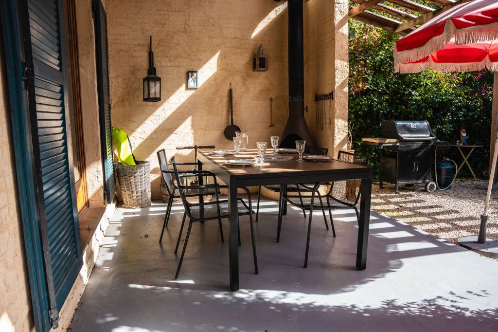 Barbecue au gaz. chaises longues, salons de jardin, hamac pour profiter du jardin.