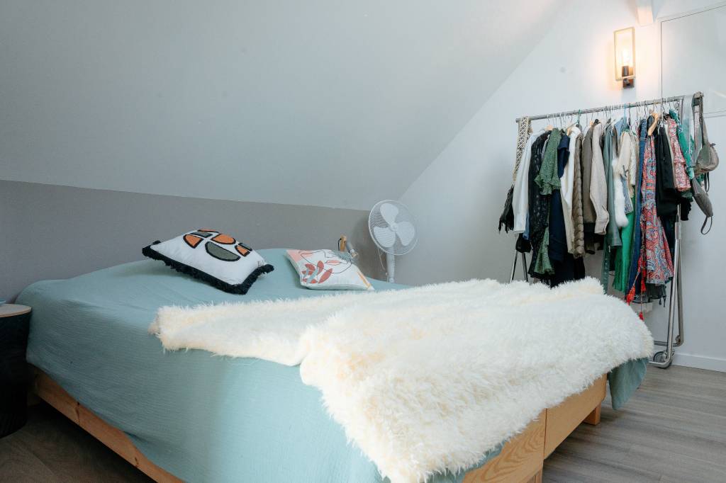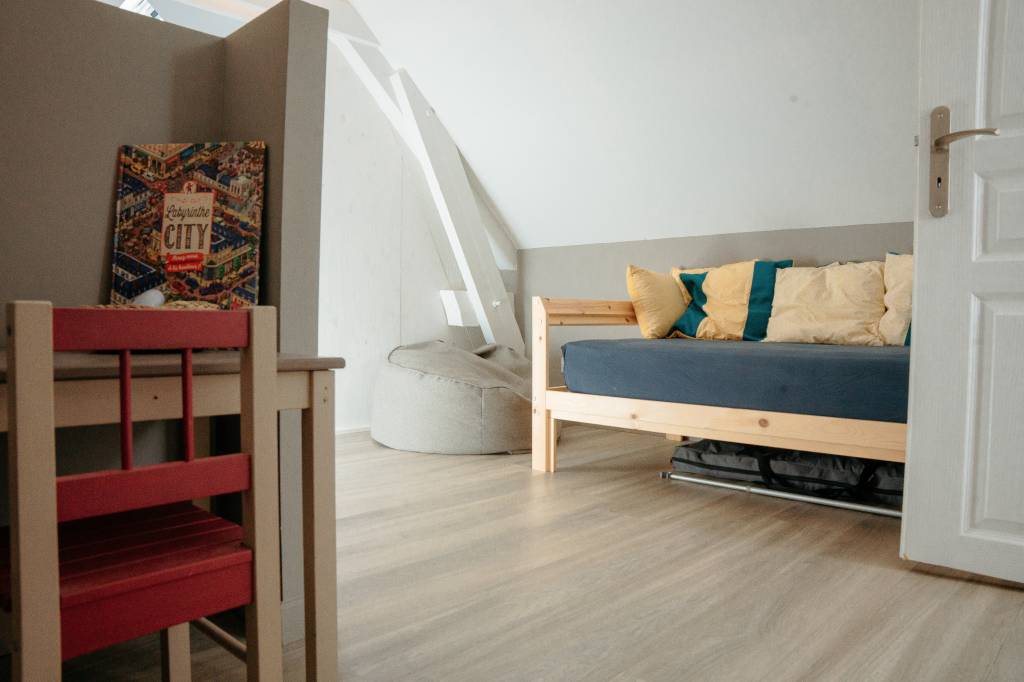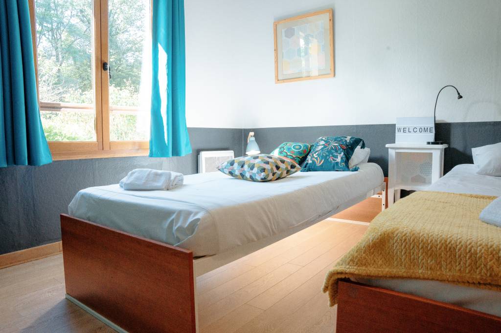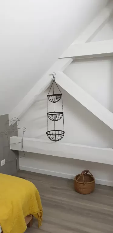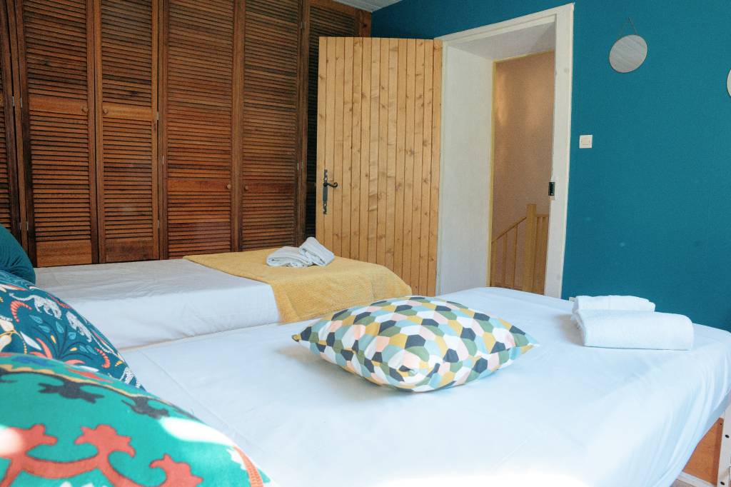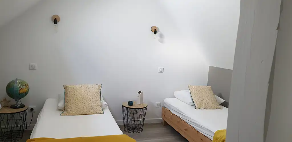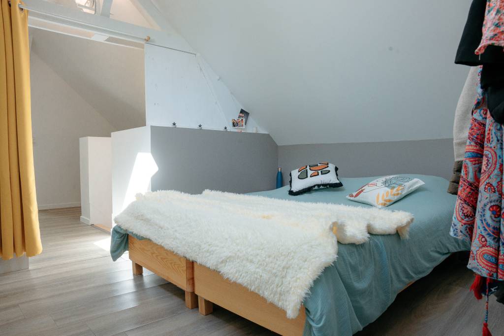 La longère est divisée en 2, l'autre partie est à usage privé, occupé uniquement le week.end par notre fille. Le logement mis à disposition est composé de 2 chambres de 2 personnes, toutes au premier étage de la maison.